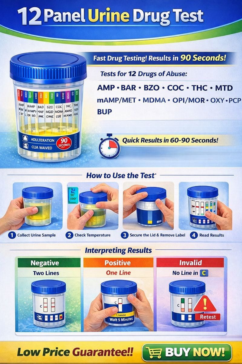 - Comprehensive Screening: Tests for 12 different drugs, including Amphetamines, Barbiturates, Buprenorphine, Benzodiazepines, Cocaine, Methamphetamines, MDMA, Methadone, Morphine (Opiates), Oxycodone, Phencyclidine, and THC.
